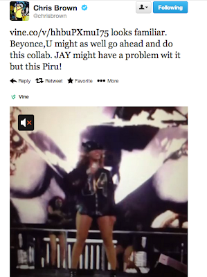 The other night Chris Brown posted a vine video of Beyonce performing Bow Down with the caption, "Looks familiar. Beyonce, U might as well go ahead and do this collab. JAY might have a problem wit it but this is Piru!"