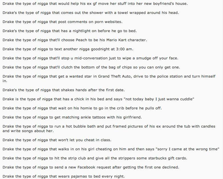 Drake The Type Of Nigga Who Eats Two Gummi Bears At A Time So They Don't Die Alone.Drake The Type Of Nigga Who'd Help His Girl Get Back With Her Ex.Drake The Type Of Nigga Who Sets His Alarm to 11:11 To Make A Wish.