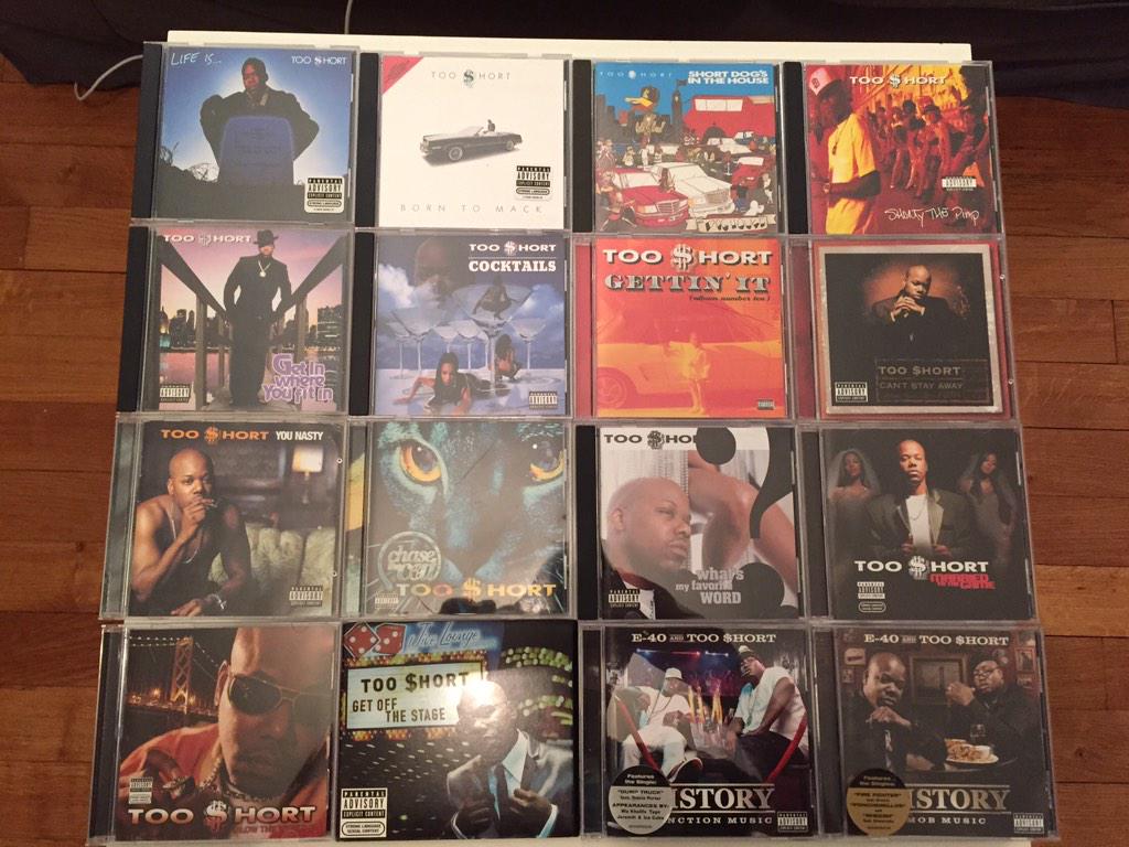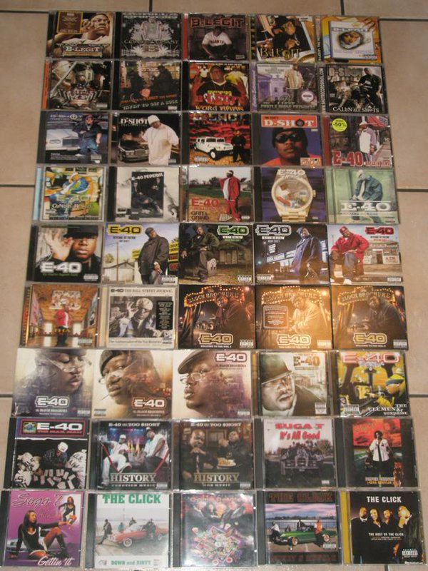 Westside Connection (Cube, WC, mack 10) bout 90 cds.I got solos, singles and promos too.Onyx 50 cd, albums, solos, promos, singlesMc Eiht 45 cd CMW, solos, albums, comps, singles, promos.The Click (e-40, suga-t, B-legit, D-shot) 50 cdsand i got every cd (solos, groups) from Alkaholiks, Cypress Hill, most of Too $hort, Spice 1, CNN just to name a few...